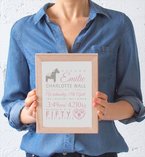 Decorate a nursery with our elegant Scandinavian themed birth print. Set in a pretty baby pink and taupe, it will compliment a classically styled nursery. Personalise with the baby's name, date of birth, weight, length and time. Printed on high quality Italian linen card stock and framed in a premium white frame, our birth prints make for beautiful keepsakes for proud parents.