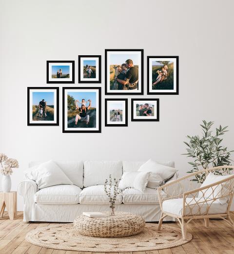 Choose from a wide range of gallery wall configurations in crisp white, matt black or beautiful oak frames. Upload your photographs and instantly see them in the context of a room.