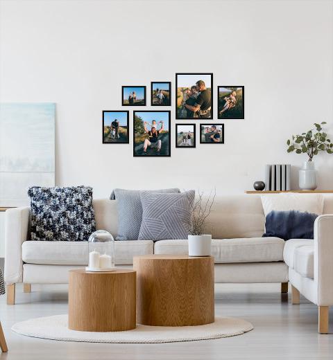 Choose from a wide range of gallery wall configurations in crisp white, matt black or beautiful oak frames. Upload your photographs and instantly see them in the context of a room.