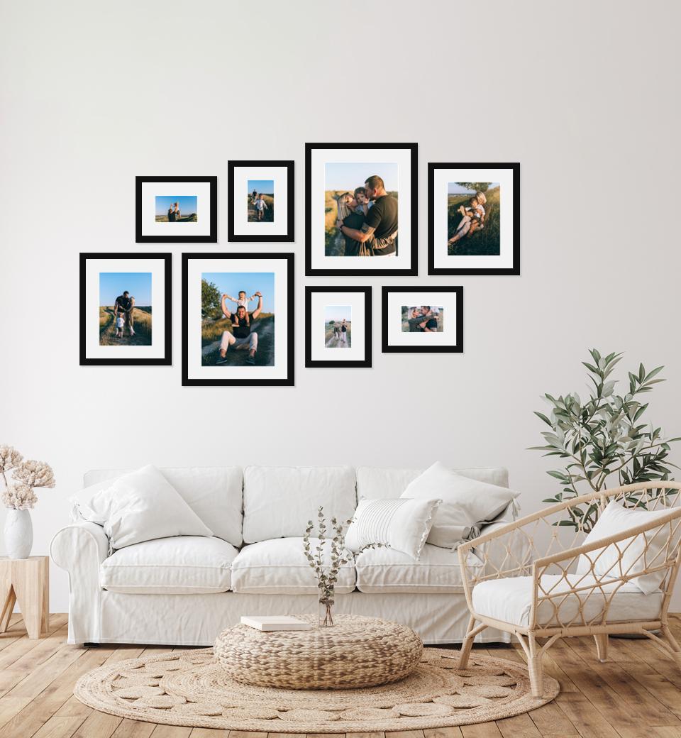 Choose from a wide range of gallery wall configurations in crisp white, matt black or beautiful oak frames. Upload your photographs and instantly see them in the context of a room.