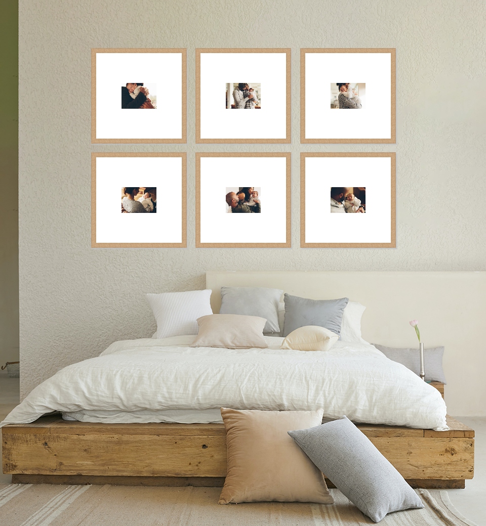 Choose from a wide range of gallery wall configurations in crisp white, matt black or beautiful oak frames. Upload your photographs and instantly see them in the context of a room.