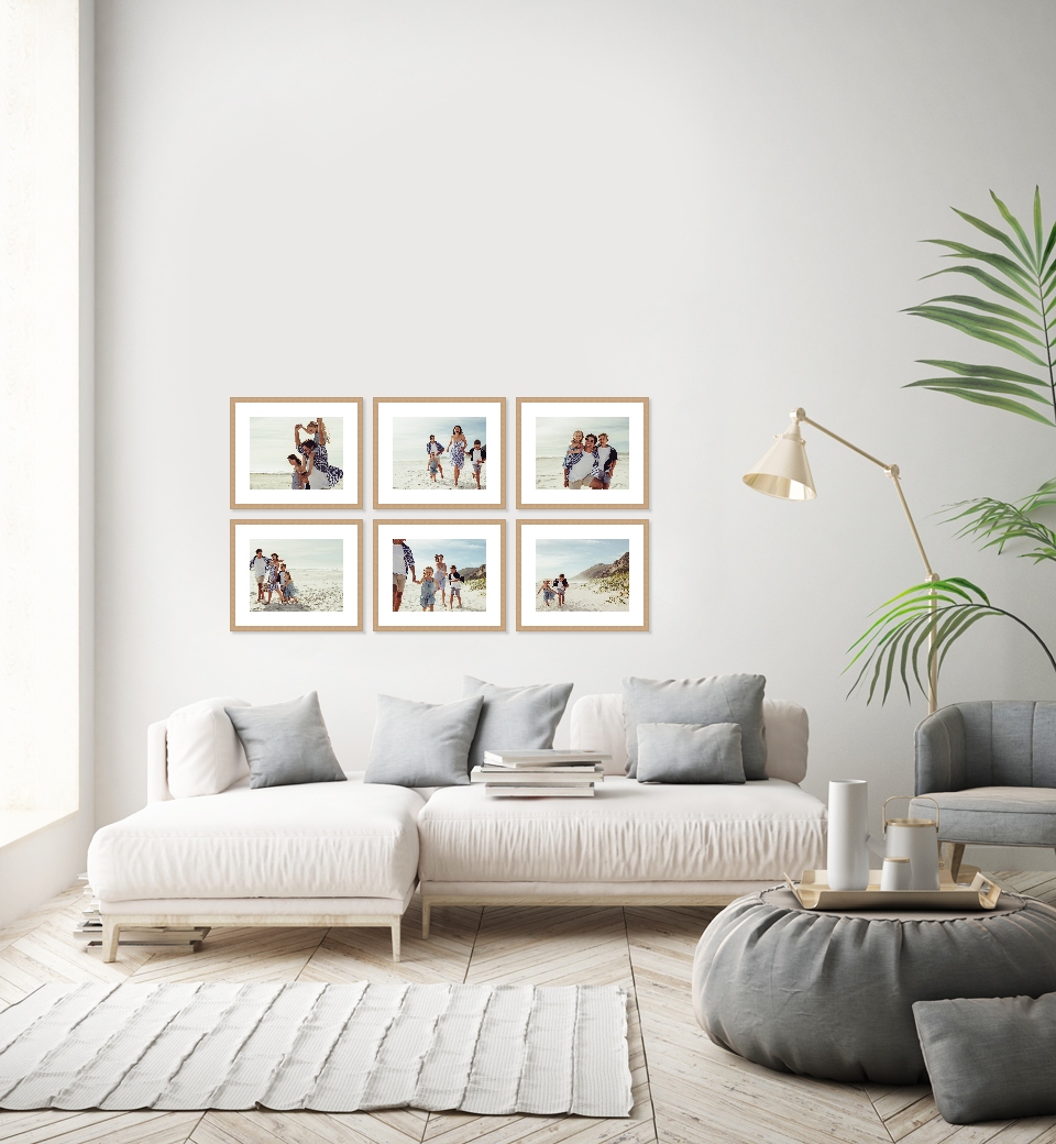 Choose from a wide range of gallery wall configurations in crisp white, matt black or beautiful oak frames. Upload your photographs and instantly see them in the context of a room.