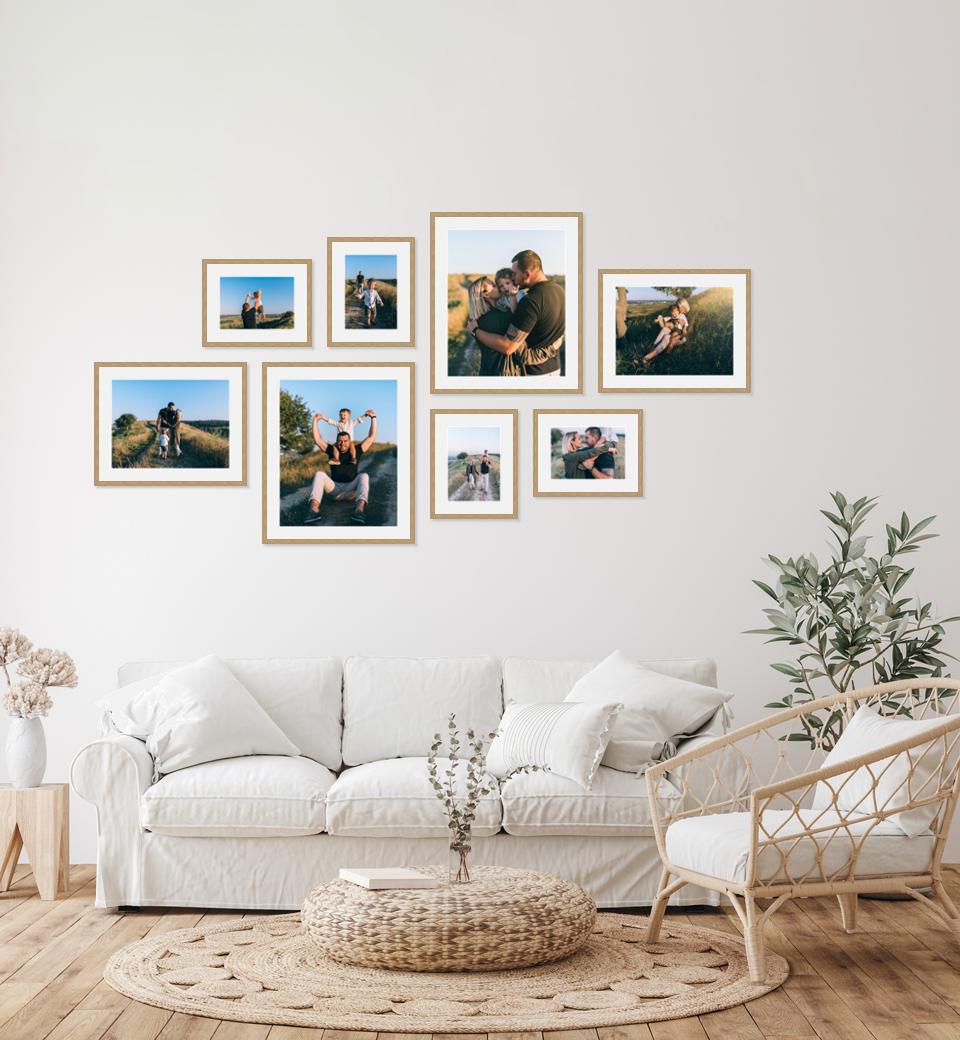 Choose from a wide range of gallery wall configurations in crisp white, matt black or beautiful oak frames. Upload your photographs and instantly see them in the context of a room.