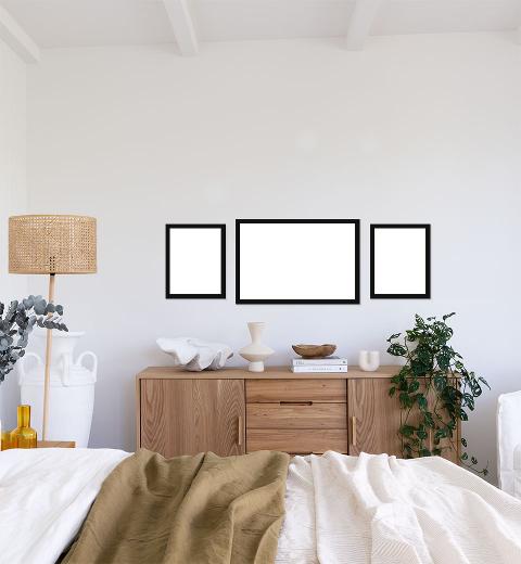 Choose from a wide range of gallery wall configurations in crisp white, matt black or beautiful oak frames. Upload your photographs and instantly see them in the context of a room.