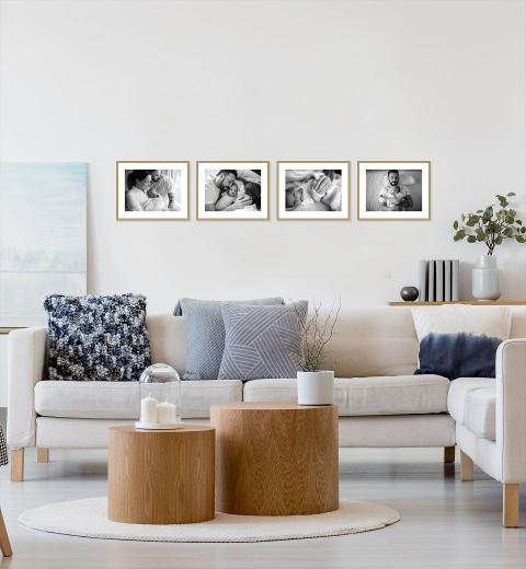 Choose from a wide range of gallery wall configurations in crisp white, matt black or beautiful oak frames. Upload your photographs and instantly see them in the context of a room.