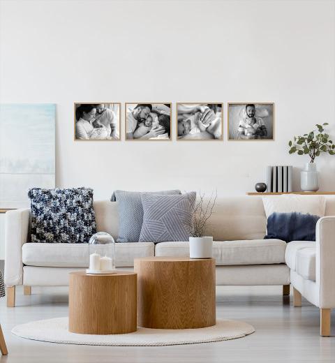 Choose from a wide range of gallery wall configurations in crisp white, matt black or beautiful oak frames. Upload your photographs and instantly see them in the context of a room.