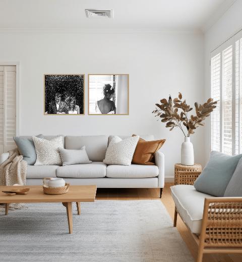 Choose from a wide range of gallery wall configurations in crisp white, matt black or beautiful oak frames. Upload your photographs and instantly see them in the context of a room.