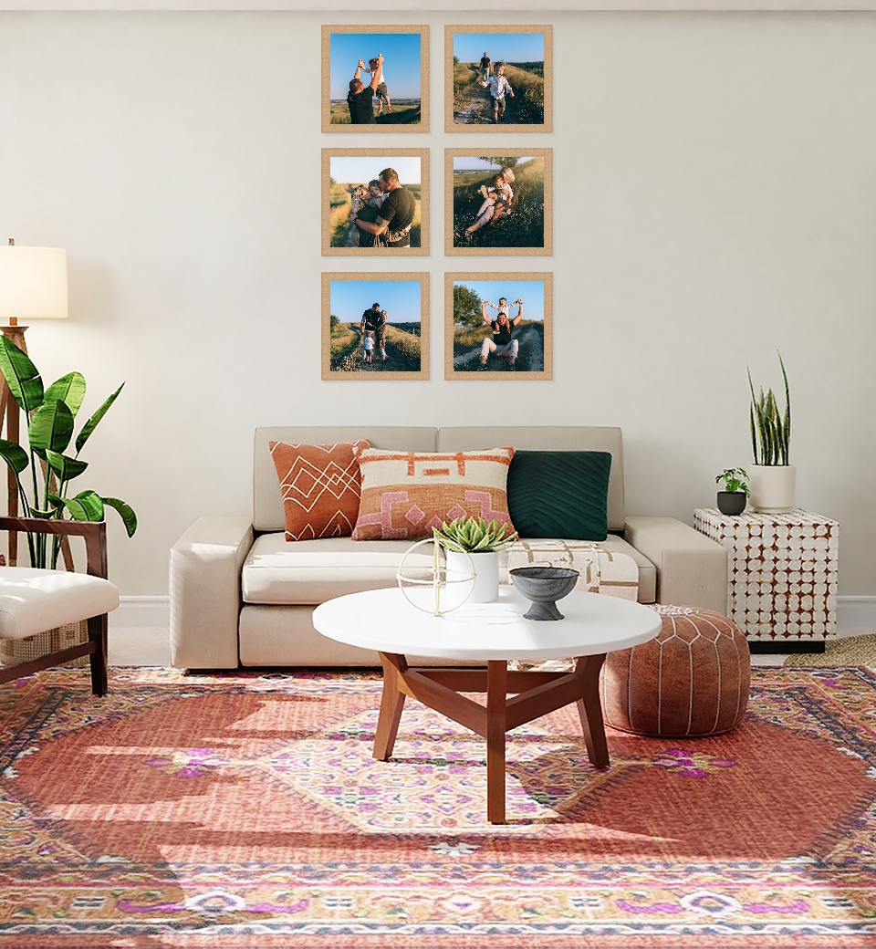 Choose from a wide range of gallery wall configurations in crisp white, matt black or beautiful oak frames. Upload your photographs and instantly see them in the context of a room.