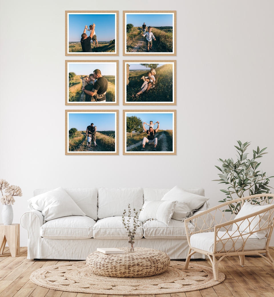 Choose from a wide range of gallery wall configurations in crisp white, matt black or beautiful oak frames. Upload your photographs and instantly see them in the context of a room.